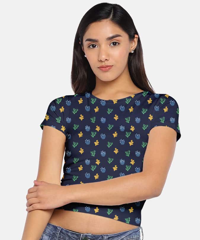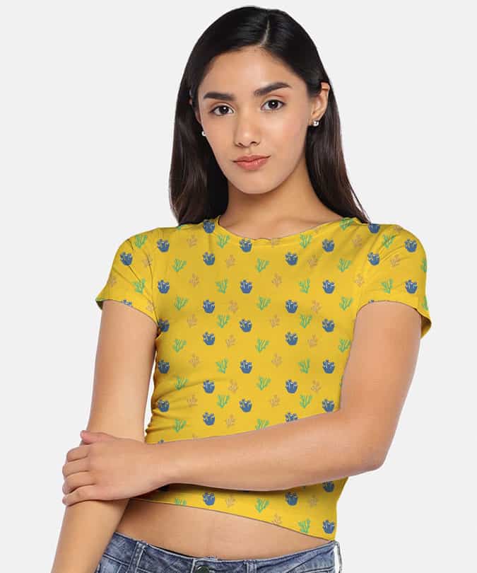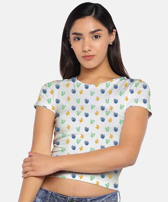 DESCRIPTION: The fresh, neoteric, spectacular corals, which will make you want to hit the beach. Get a snazzy glamorous look with Medlle’s The Coral Print crop top. Feel the comfort and durability, complement it with denim or shorts for a relaxed style.